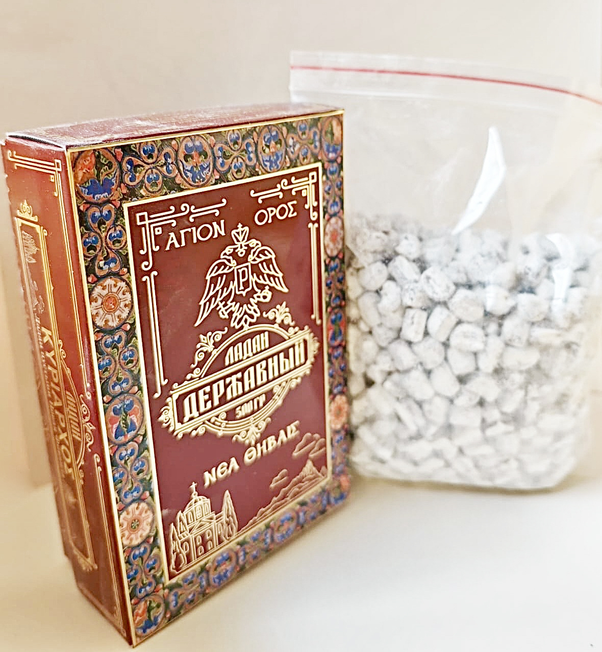 Ладан производства пустыни Новая Фиваида Русского на Афоне Пантелеимонова монастыря. Ладан сделан из смолы олибанум с добавлением благовоний из Греции.